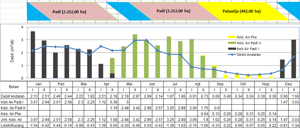 Berdasarkan grafik diatas maka kelihatan bahwa kebutuhan air pada musim tanam Padi I dan Padi II lebih besar dari debit air yang tersedia di sungai. Oleh karena itu, agar mencapai intensitas tanam sesuai rencana maka perlu dilakukan pemberian air secara giliran.