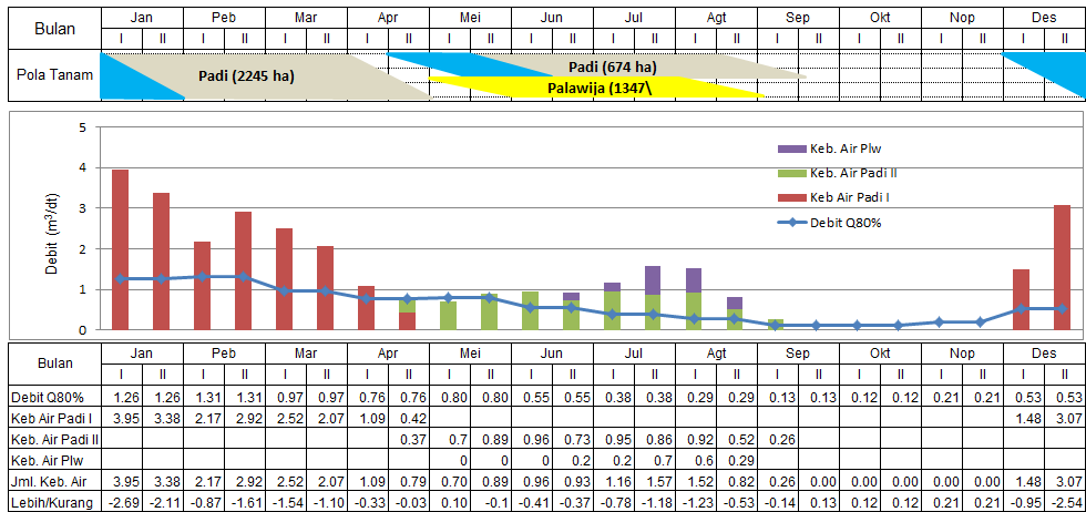 Berdasarkan grafik diatas maka kelihatan bahwa kebutuhan air pada musim tanam Padi I dan Padi II lebih besar dari debit air yang tersedia di sungai, oleh karena itu agar mencapai intensitas tanam sesuai rencana maka perlu dilakukan pemberian air secara giliran.